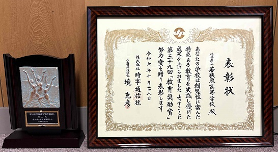 時事通信社「教育奨励賞」は、創造性に富んだ特色ある教育の実践を行った教育機関に送られる賞です。今年度は全国にあるすべての小学校や中学校、高校、特別支援学校等数万校の中から30団体が受賞しました。地域社会に根差した教育として、本校の取り組みが全国の教育機関を対象とした賞をいただくことができました。