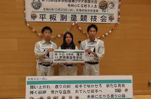 私たち、森田、水尾、樋村の3人で、第75回日本学校農業クラブ全国大会に出場して優秀賞に輝きました。作業中に雨が降らないか不安があったけど、練習成果を発揮して水平誤差のない正確な測量ができました。優秀賞に輝くことができたのは、これまで3人で頑張って測量技術を高めてきた練習があったからです。