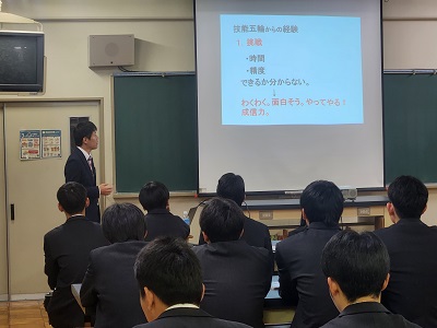 12月17日、電気・機械科電気コースでは、本校を卒業され、株式会社きんでんに入社された木下富博氏に「卒業生による講演会」として、卒業後のことや将来についてご講演頂きました。