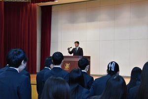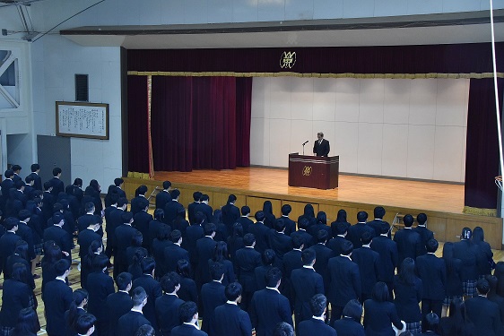冬休みを終え、新年を迎えての学校生活の再開に多くの生徒たちが明るい表情を見せていました。校長先生から既存の姿にとらわれ過ぎず、物事に挑戦していくことの大切さと学校生活についてのお話をいただきました。庶務部長からは芝生を育てることを例えとして、人との関わり合いについて訓話をいただきました。