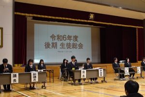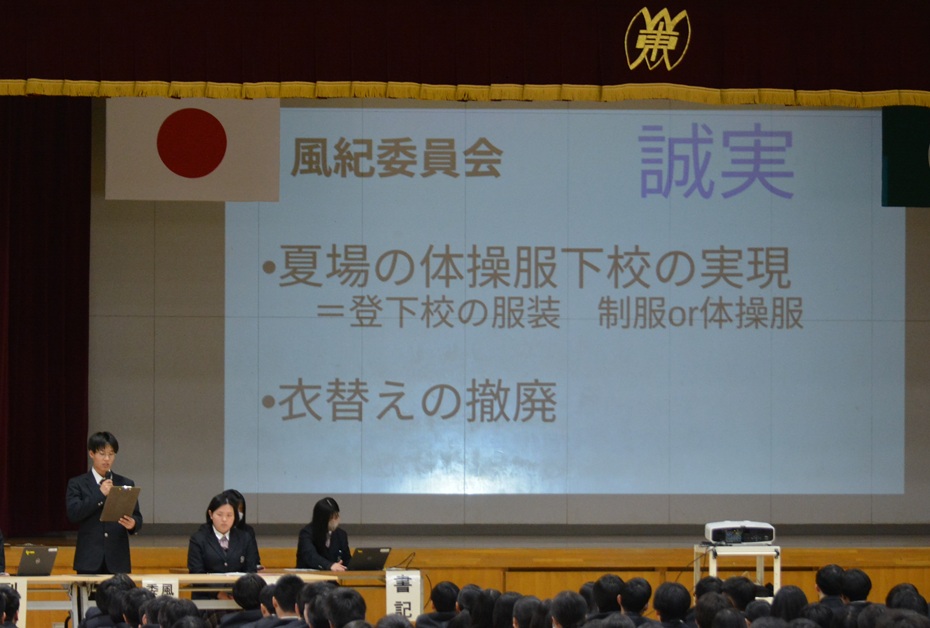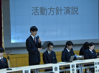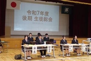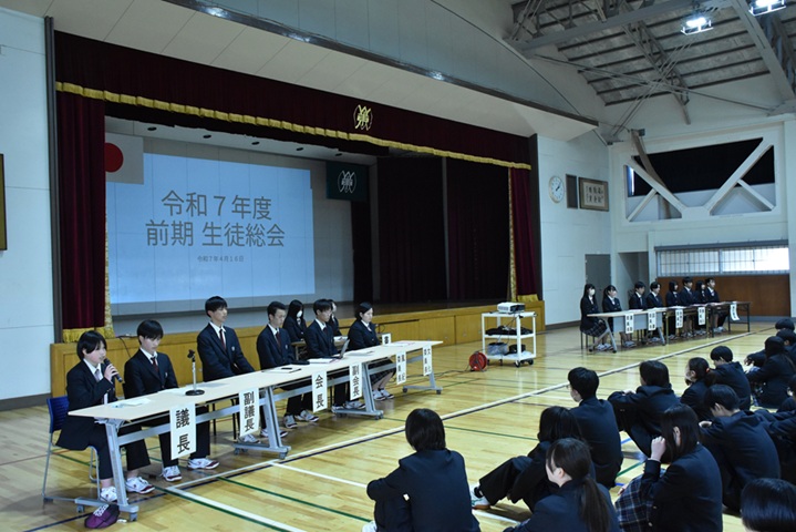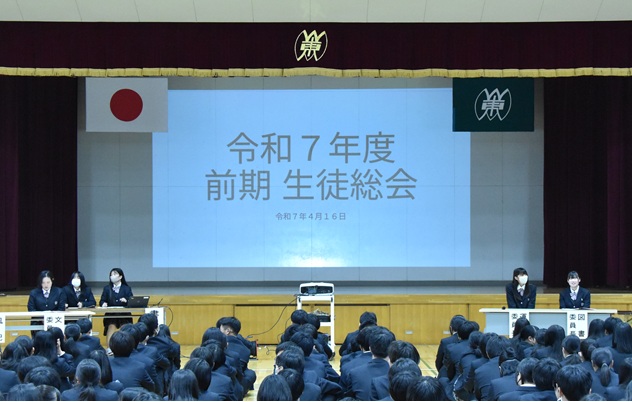 生徒会2025.04.22 2025.05.27 cmsadmin20 令和7年度 前期生徒総会 4月16日(水)、令和7年度の前期生徒総会が行われました。今年度の生徒会スローガンの発表や校訓を意識した活動計画が示されました。 生徒会役員生徒会長 活動方針演説各委員長より
