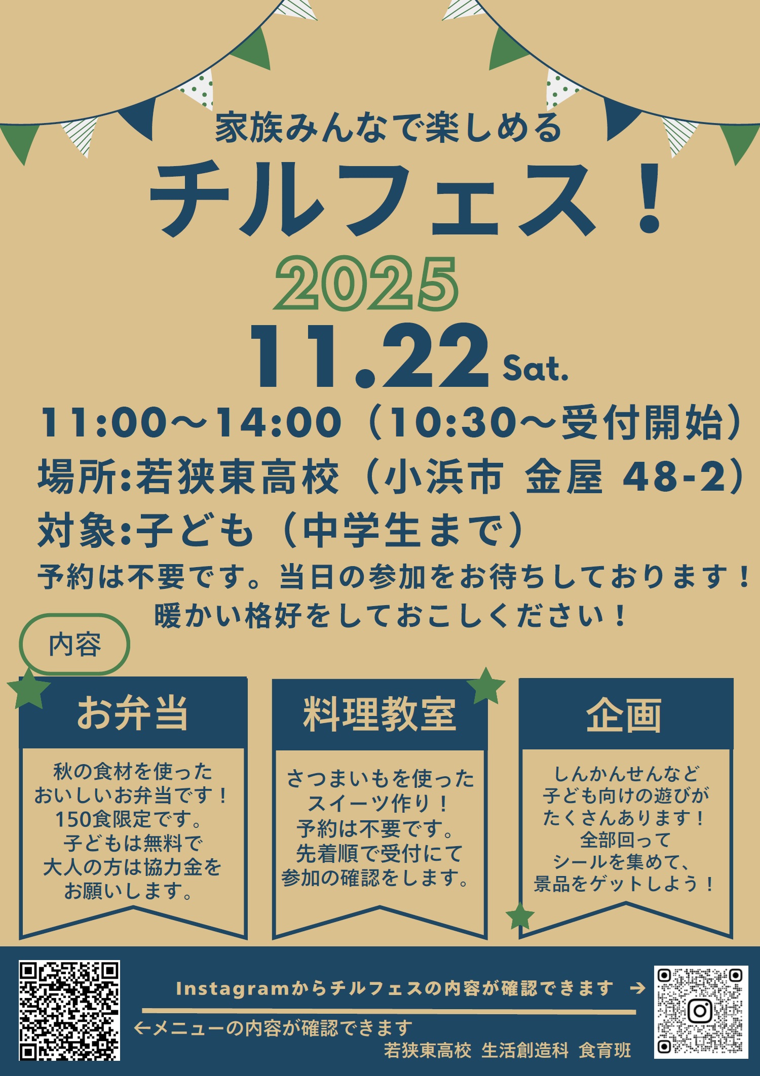 生活創造科2025.11.13 2025.11.21 cmsadmin20 チルフェス2025 開催します 11月22日(土)に、チルフェス2025を開催します。対象は子ども(中学生まで)、予約は不要です。皆様のご来場をお待ちしております。 ※ チルフェスの詳細はこちらをご覧ください。(Instagram) ※ メニューはこちらをご覧ください。(pdf)