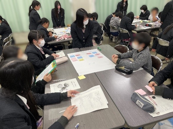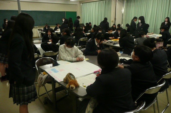 1年間取り組んできた、調査研究活動、作品製作、資格取得などの成果を発表する「課題研究発表会」を実施しました。当日は、雲浜小学校の6年生も発表会に参加。発表後には、参加者全員で、グループトークを行いました。