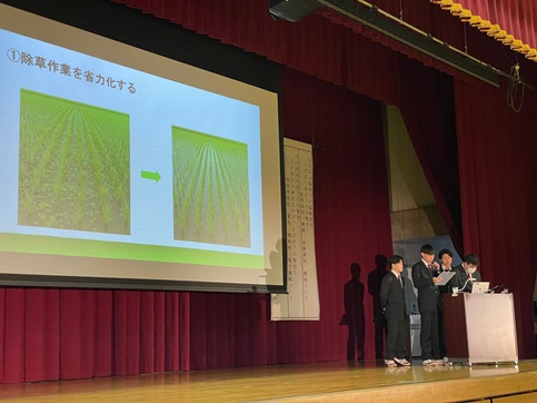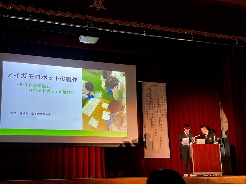 2月5日に福井県工業学科課題研究発表会が開催され、本校代表として電気・機械科電子機械コース3年が参加しました。参加した班の研究テーマは「アイガモロボットの製作」で、昨年度から継続研究されているものとなります。今年度は工業化学の分野にも挑戦し、FRPに関する研究を進めたうえで、ロボットボディの製作を行い、その成果を発表しました。審査員からは、「スマート農業は、農業の担い手不足の課題を解決するために注目されており、ぜひ実用化に向けて研究を継続してほしい」等のコメントをいただきました。今後も研究を進めていき、本校の水田等で実証実験を進めていきたいと思います。