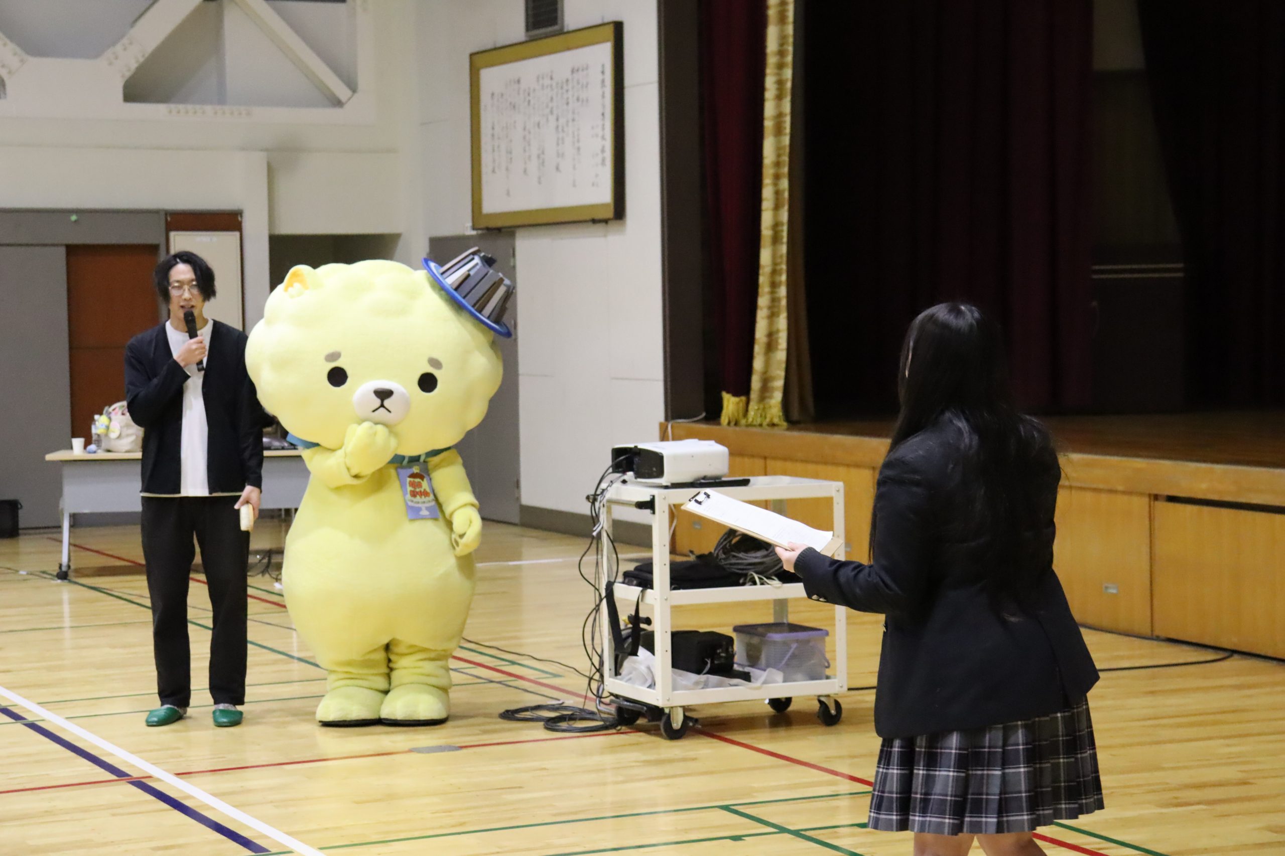 課題研究のテーマ設定に向けて、坂井市役所の小玉悠太郎氏を招いて、本校の第一体育館にて講演会を行いました。町おこしの手法をテーマに外部とのつながりや進め方を学びました。また、坂井市の人気マスコットキャラほや丸も登場しました。