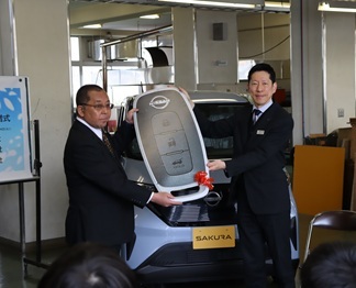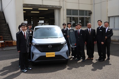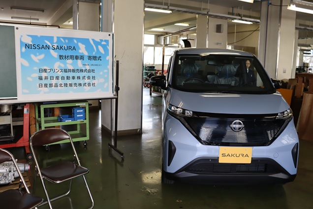 3月24日に日産プリンス福井販売株式会社様、福井日産自動車株式会社様、日産部品北陸販売株式会社様の各社より、工業創造科の教材用車両として、電気自動車の日産サクラをご寄贈いただきました。