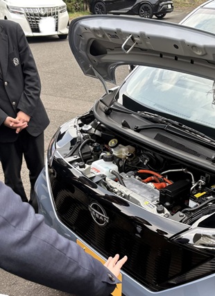 また、寄贈式後には、乗車してみたり、お越しいただいた各社の皆様より、電気自動車の特徴や、ボンネット内にある装置の説明をお聞きしました。