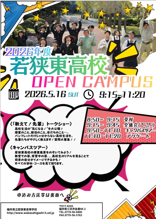 本校では、中学生の皆さんに若狭東高校の魅力をより深く知っていただくため、オープンキャンパスを実施します。