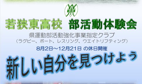中学生のみなさん、若狭東高校の部活動を体験してみませんか⁉若狭東高校には、中学校にはない部活動もあります。ぜひ、体験しに来てください。 申し込みはこちらのフォームよりお願いします。